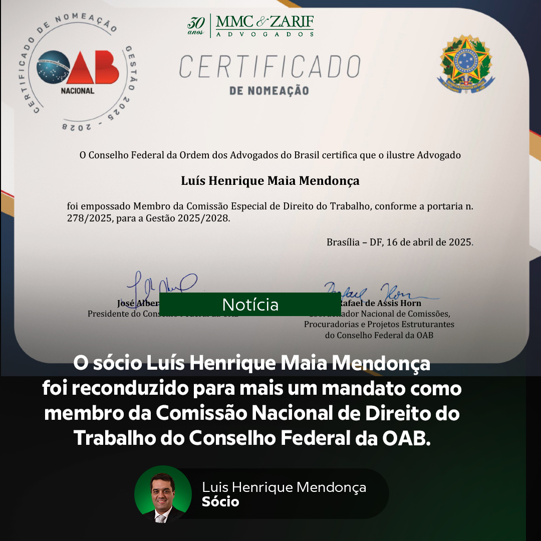 O sócio Luís Henrique Maia Mendonça foi reconduzido para mais um mandato como membro da Comissão Nacional de Direito do Trabalho do Conselho Federal da OAB.